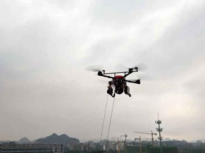 “我這邊準(zhǔn)備好了,可以起飛了!”一聲令下,停放在相距數(shù)十公里的兩端試驗(yàn)點(diǎn)上的系留無人機(jī)同時起飛,在駕駛員全神貫注地操作下,無人機(jī)緩緩升空,并平穩(wěn)地懸停在上方數(shù)十米處。