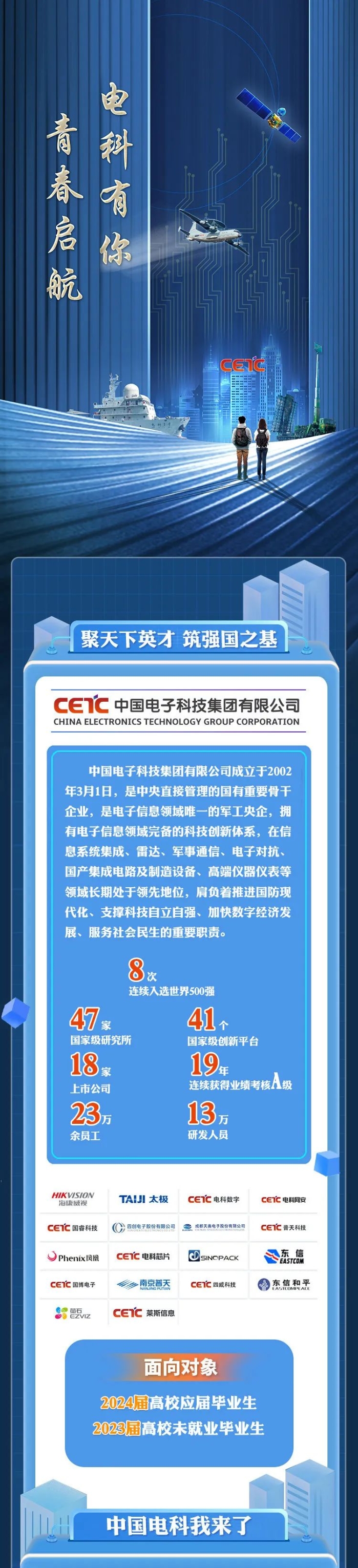 中國電子科技集團有限公司是中央直接管理的國有重要骨干企業(yè),擁有電子信息領域完備的科研創(chuàng)新體系,在國內軍工電子和網(wǎng)信領域占據(jù)技術主導地位,肩負著實現(xiàn)國防現(xiàn)代化、支撐數(shù)字經濟發(fā)展、服務社會民生的職責使命。