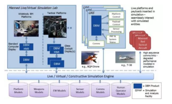 - 2018年1月,DARPA已向BAE系統(tǒng)公司授予DBM項目第三階段合同,前兩階段發(fā)展的成果能讓有人/無人機編組在干擾環(huán)境中飛行,具備回避威脅和攻擊目標的能力。圖3是DBM項目的能力驗證環(huán)境。