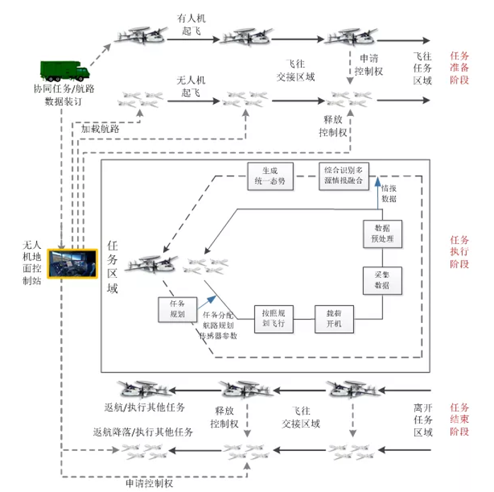 有人/無人機協(xié)同作戰(zhàn)典型作戰(zhàn)流程如圖10所示,共分成任務準備階段、任務執(zhí)行階段和任務結束階段。